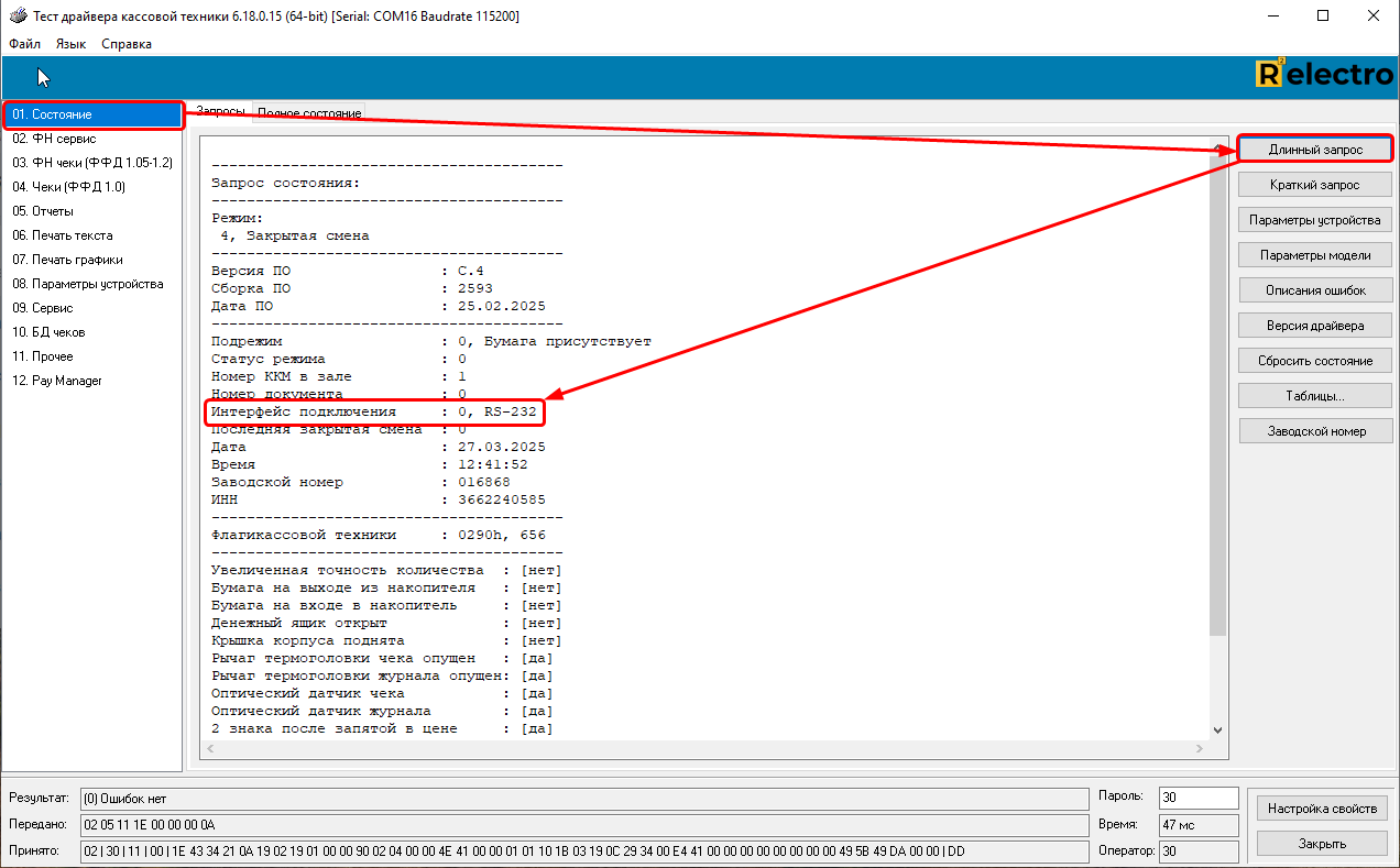 Данная инструкция подходит, если интерфейс подключения 0, значит, аппарат подключен по RS-232.