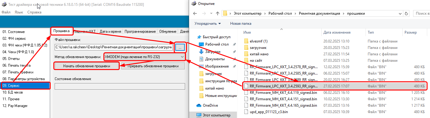 Заходим в меню Сервис - вкладка "Прошивка" - Выбираем файл загрузчика или прошивки - Начать обновление прошивки:
