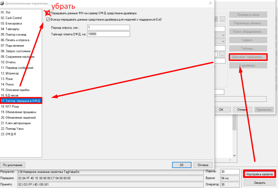 На прошивке версии С.3 (Только ФФД 1.2) передача через Тест Драйвера не работает при любых настройках, данная галочка, опять же, провоцирует данную ошибку командой FF30h (Запросить о наличие данных в буфере):