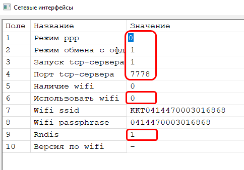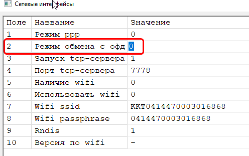 В Тесте Драйвера заходим в Настройку свойств - Таблицы - Сетевые интерфейсы и ставим значение поля 9.RNDIS на 1. Нажимаем Enter. Проверяем что режим обмена с ОФД включен и WI-FI отключен: