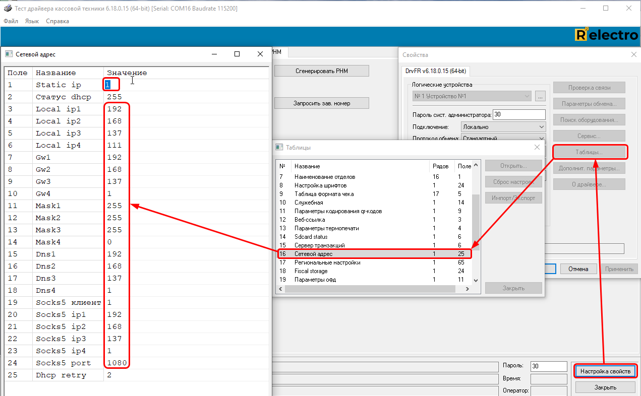 В Тесте Драйвера заходим в Настройку свойств - Таблицы - Сетевые интерфейсы - 16.Сетевой адрес и ставим значения таким образом и нажимаем Enter: