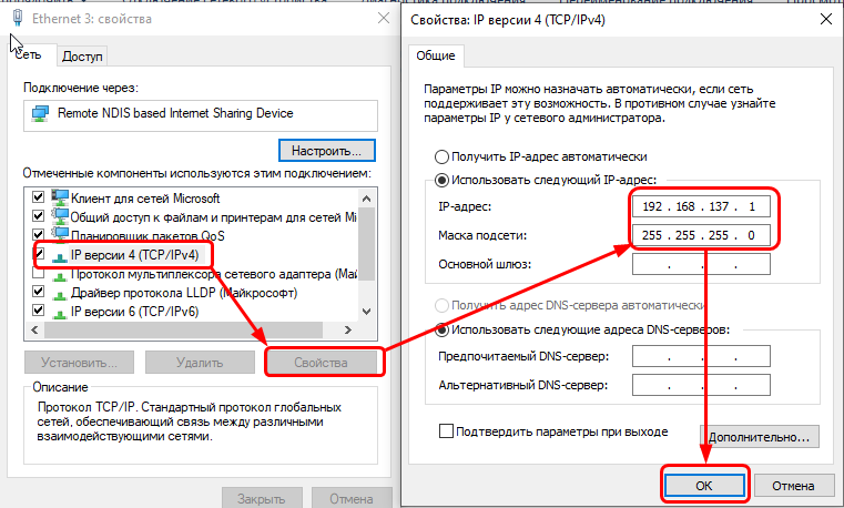 Заходим в свойства адаптера RNDIS и устанавливаем вручную IP 192.168.137.2: