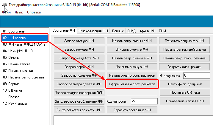 Если нет возможности перезагрузить, то есть включить и выключить аппарат, так как работаете удаленно, то заходим в тесте драйвера в 17. Прочее - Команда - Команда, HEX - FE F3 00 00 00 00 - Передать: