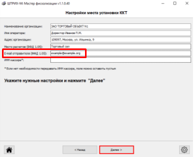 Что "E-mail отправителя чека (ФФД 1.05) соответствует формату "текст@текст". Укажите его согласно вашему ОФД: